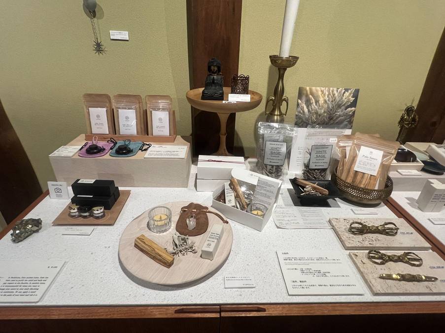 店内には「香り」を中心に、心を整える商品が並びます。お香は普通のタイプだけでなくパウダー状で携帯できるものも。さらに、浄化作用があると言われるホワイトセージや水晶、気の流れを整えると言われるろうそくなどを詰め合わせたセットは、プレゼントとしても人気とのことでした。