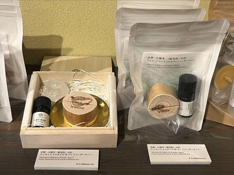 「YUGUE KYOTO(ユゲキョウト)- KURA -」の2階では、予約申込制のワークショップ体験を行っています。ワークショップでは大徳寺総見院のスギ精油を使ったブレンド精油作りとルームスプレー作り、そして瞑想の体験ができます。今回はアロマスプレー作りと瞑想体験をさせていただきました。