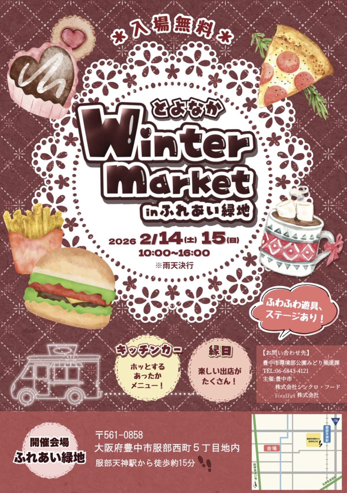 豊中市の「豊中ふれあい緑地」で開催される、冬の週末を楽しむ2日間のマーケットイベント。フードキッチンカーだけでなく、子どもが喜ぶ縁日やふわふわ遊具も。