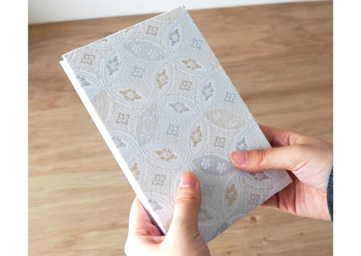 サカイさんは、実際にケイクスで作っている御朱印帳を見せてくださいました。その表紙に使われていたのは、先染めされた糸で織りなされた繊細な模様。織物ならではの立体感を帯びた生地は、触れるだけでも愛着が湧きます。